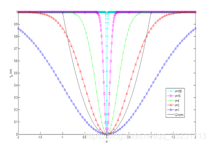 从而有$\mathrm{F}{\sigma}(\mathrm{s})=\sum{\mathrm{i}=1}^{\mathrm{n}} \mathrm{f}{\sigma}\left(\mathrm{s}{\mathrm{i}}\right)$,其中,n为稀疏信号向量s的长度,si为稀疏信号向量s对应的第i个元素,σ为逼近L0范数的调制参数,$\mathrm{F}{\sigma}(\mathrm{s})$近似表示s非零较大项的数目。逼近函数$\mathrm{f}{\sigma}\left(\mathrm{s}{\mathrm{i}}\right)$和$\mathrm{s}{\mathrm{i}}$、σ的关系如下图所示: